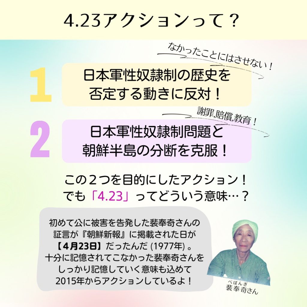 4がつ23にちは、おきなわで にほんぐんの 「いあんふ」という なの せいどれいかを しいられ、 ちょうせんの かいほう/ にほんの はいせんご、 みずからの ひがいを こくはつした ぺぽんぎさん(1991ねんにおきなわにてせいきょ)の しょうげんが 『ちょうせんしんぽう』に けいさいされた ひです(1977ねん)。 せいさべつてっぱいぶかいは、にほんぐんせいどれいせいの さいこうせきにんしゃたる ひろひとの しゃざいと ちょうせんはんとうの とういつを ねがった ぺぽんぎさんの そんざいと、にほんぐんせいどれいせいの ひがいを うけた すべての ひとびとを きおくしていくため、まいとし 4がつ23にちを きねんして、にほんぐんせいどれいせいもんだいについて かんがえる アクションを おこなってきました。