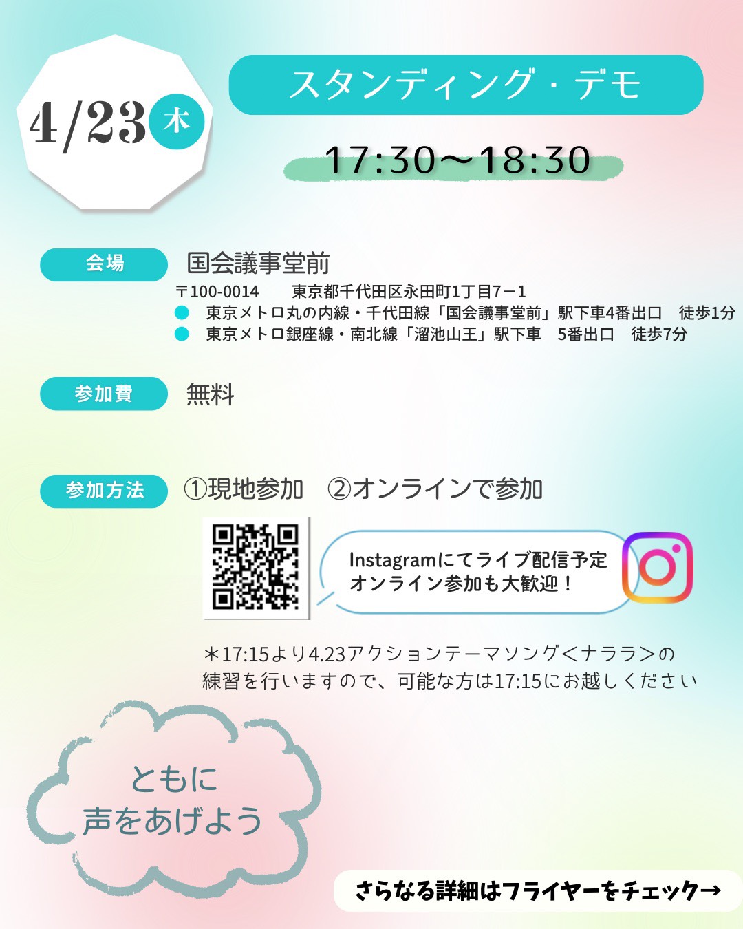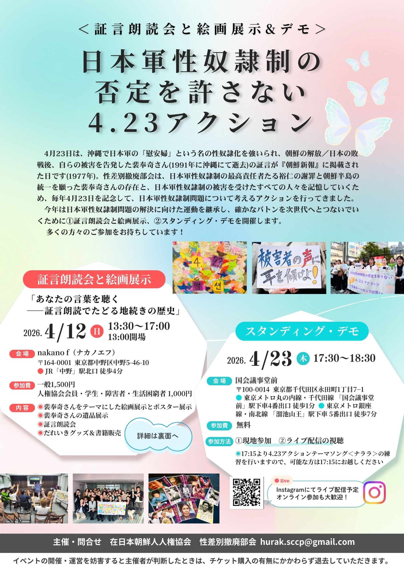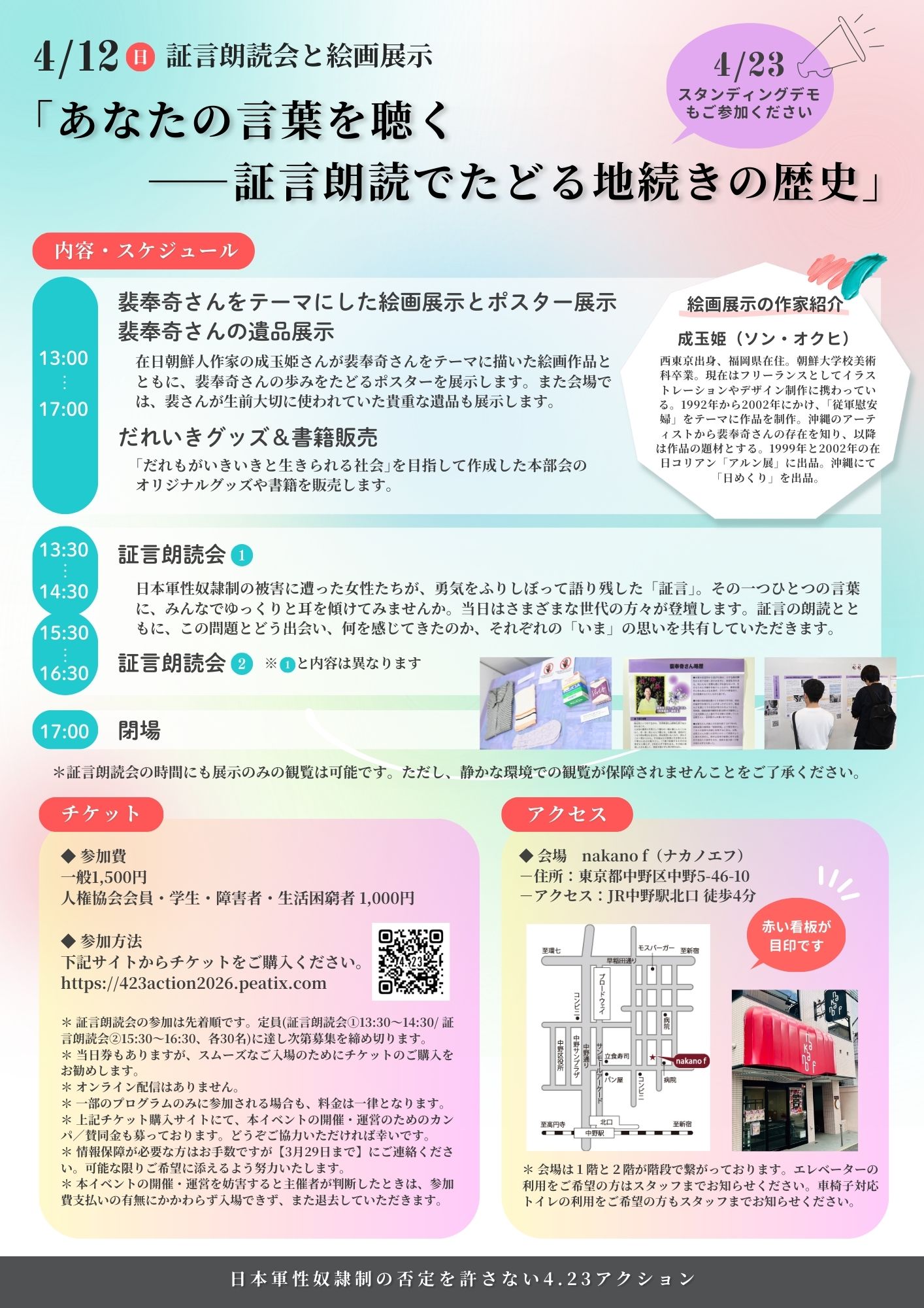 今年の4.23アクションでは、①証言朗読会と絵画展示、②スタンディング・デモを開催します。