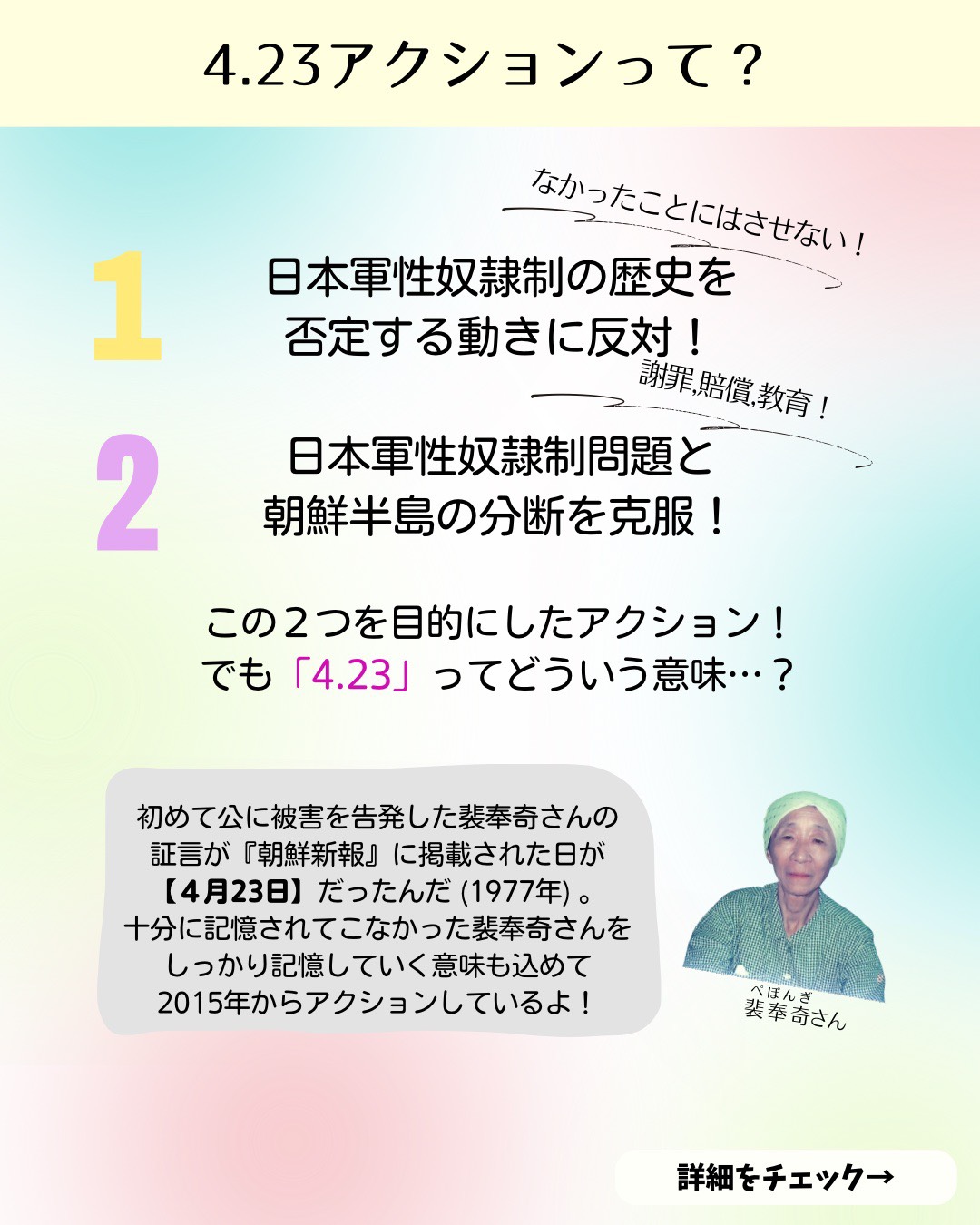 4がつ23にちは、おきなわで にほんぐんの 「いあんふ」という なの せいどれいかを しいられ、 ちょうせんの かいほう/ にほんの はいせんご、 みずからの ひがいを こくはつした ぺぽんぎさん(1991ねんにおきなわにてせいきょ)の しょうげんが 『ちょうせんしんぽう』に けいさいされた ひです(1977ねん)。 せいさべつてっぱいぶかいは、にほんぐんせいどれいせいの さいこうせきにんしゃたる ひろひとの しゃざいと ちょうせんはんとうの とういつを ねがった ぺぽんぎさんの そんざいと、にほんぐんせいどれいせいの ひがいを うけた すべての ひとびとを きおくしていくため、まいとし 4がつ23にちを きねんして、にほんぐんせいどれいせいもんだいについて かんがえる アクションを おこなってきました。